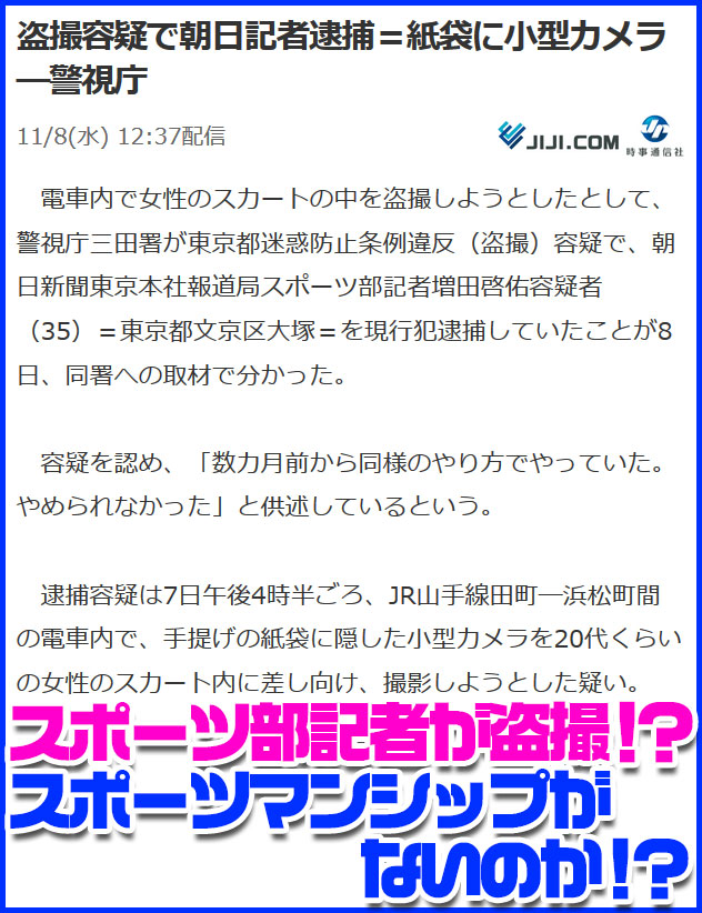 時事通信社のスポーツ部の記者が女性のスカートの中を盗撮して逮捕されたニュースについて取り上げてみたいと思います。